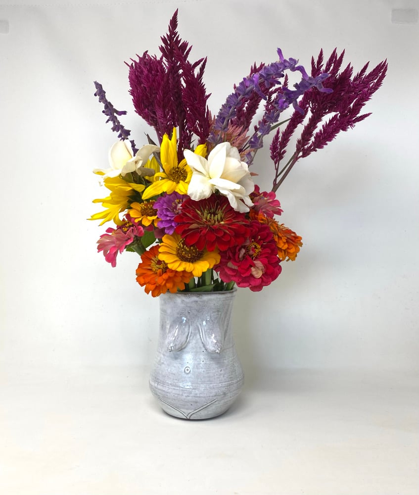 Hand thrown on the pottery’s wheel then hand sculpted. Made from Terricotta Clay and fired to a Hight temperature with a white glaze.