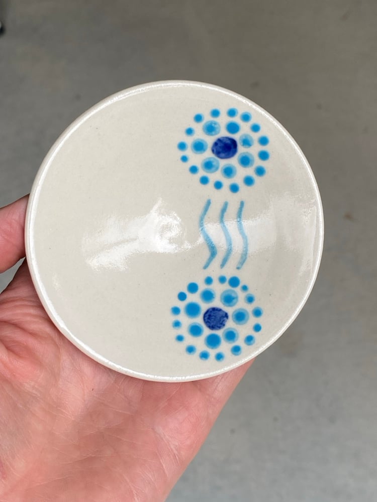 This unique Small Dot decorated bowl with turned foot was hand thrown by Ebsworth Pots and decorated by Indigenous Arrernte artist Nia Espie. The round circles of dots Represent Home/Family Separated by water.